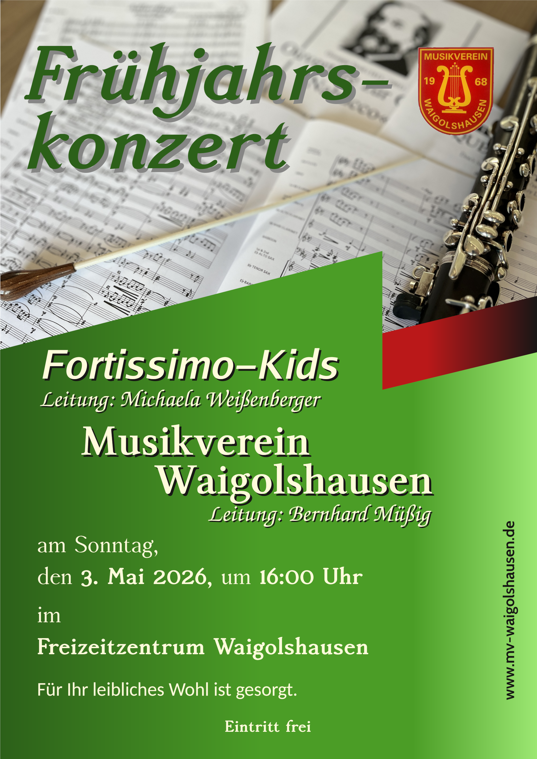 Der Musikverein Waigolshausen lädt herzlich zum diesjährigen Frühjahrskonzert ein. Unter der Leitung von Bernhard Müßig erwartet Sie ein abwechslungsreiches und unterhaltsames Programm in schönem Ambiente. Besonders freut uns, dass in diesem Jahr auch die Fortissimo-Kids, dirigiert von Michaela Weißenberger, wieder einen Beitrag zu unserem Konzert leisten werden.
