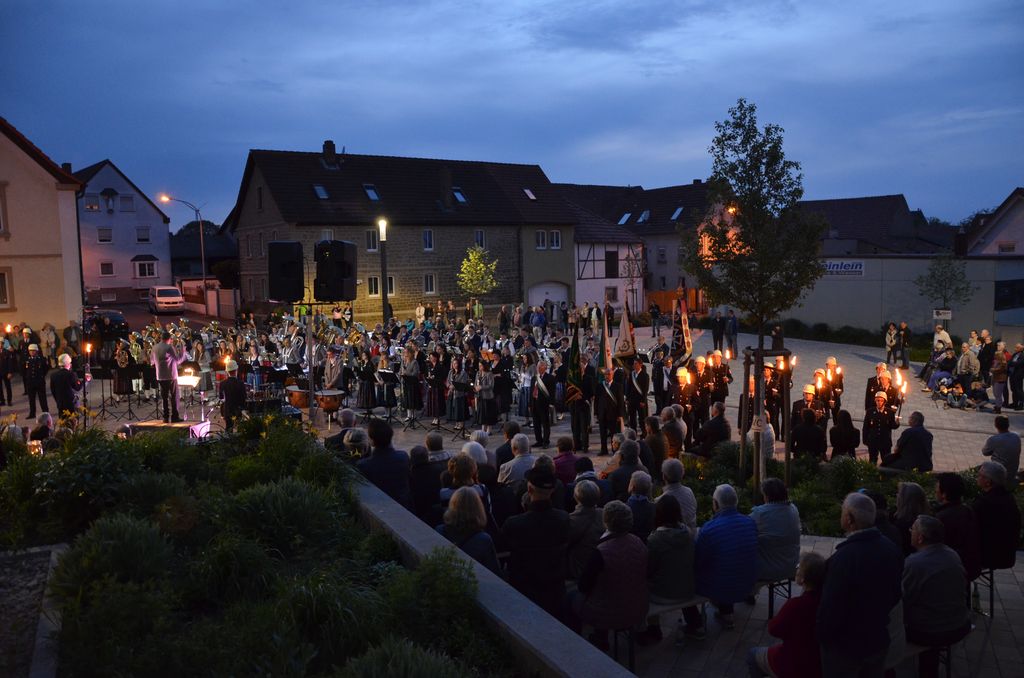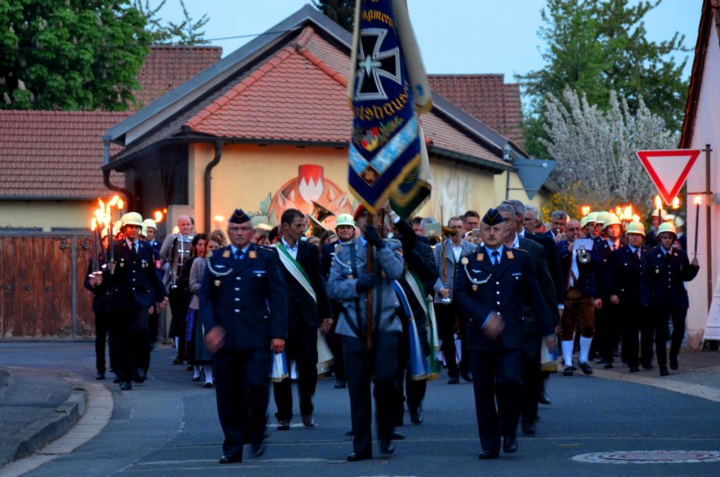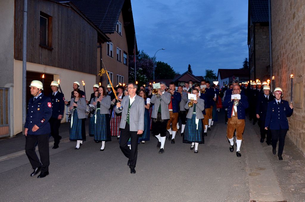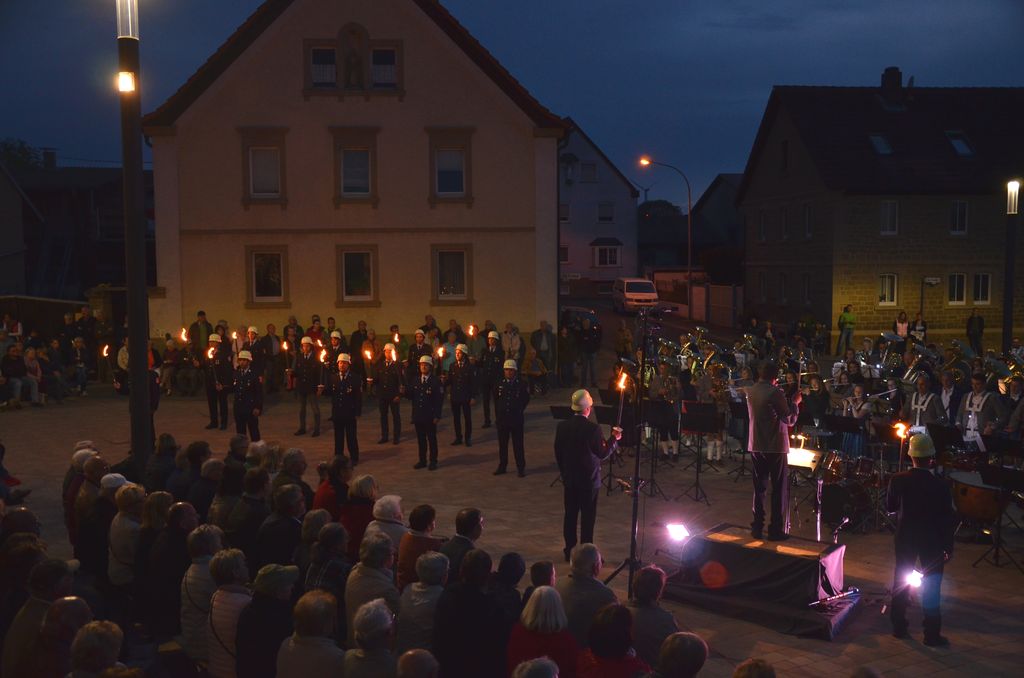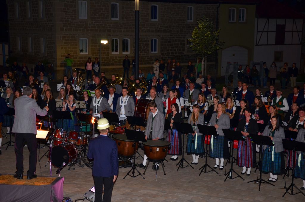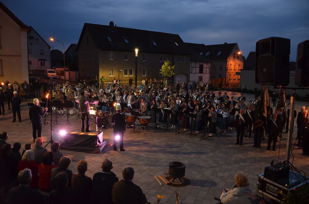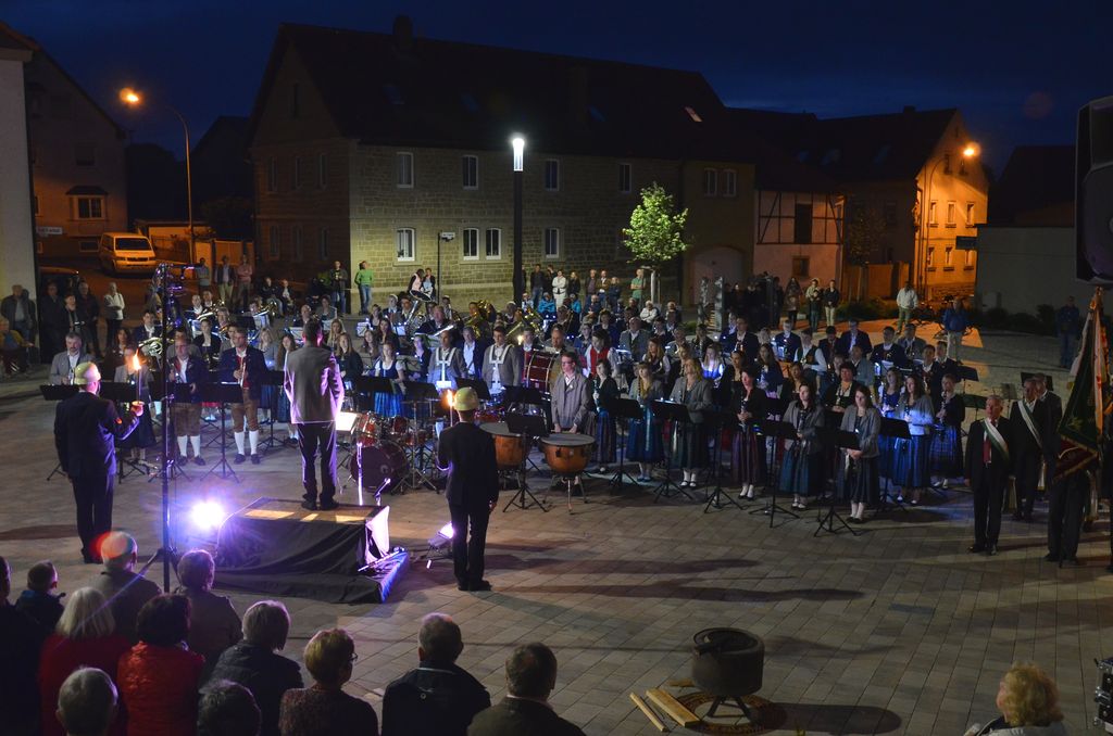 Unterstützt wurde der Musikverein Waigolshausen bei der Aufführung von den beiden anderen Musikkapellen der Gemeinde, Hergolshausen und Theilheim. So waren es am Ende fast 90 Musikanten, die bei Dämmerlicht das Publikum begeisterten. Einen würdigen Rahmen boten der Veranstaltung auch die Fackelträger der Freiwilligen Feuerwehr Waigolshausen sowie die Fahnenabordnungen der örtlichen Vereine. Während der Serenade, die dem eigentlichen Zapfenstreich vorausgeht, wurden den zahlreich erschienenen Zuhörern Stücke wie "Der große Kurfürsten Reitermarsch", "Music" von John Miles und der vom Gründungsdirigenten Siegbert Schlotter komponierte Marsch "Mit Freude und Schwung" dargeboten. Die musikalische Leitung hatte Martin Dummer, angeführt wurde die Formation vom 1. Kommandanten der Waigolshäuser Feuerwehr, Thomas Strobel.