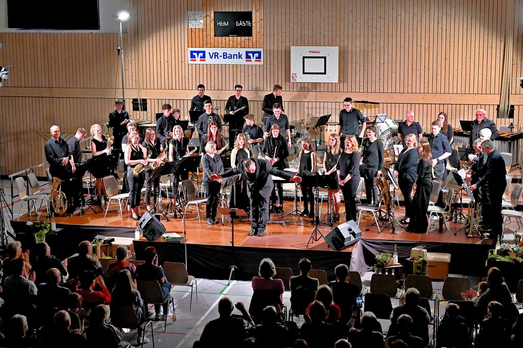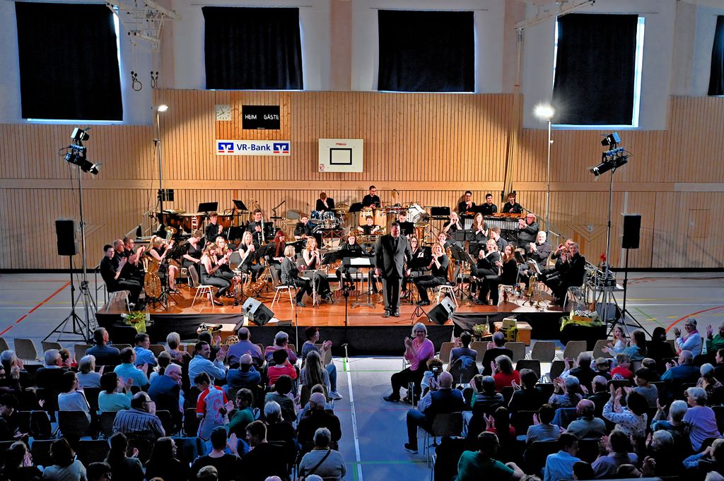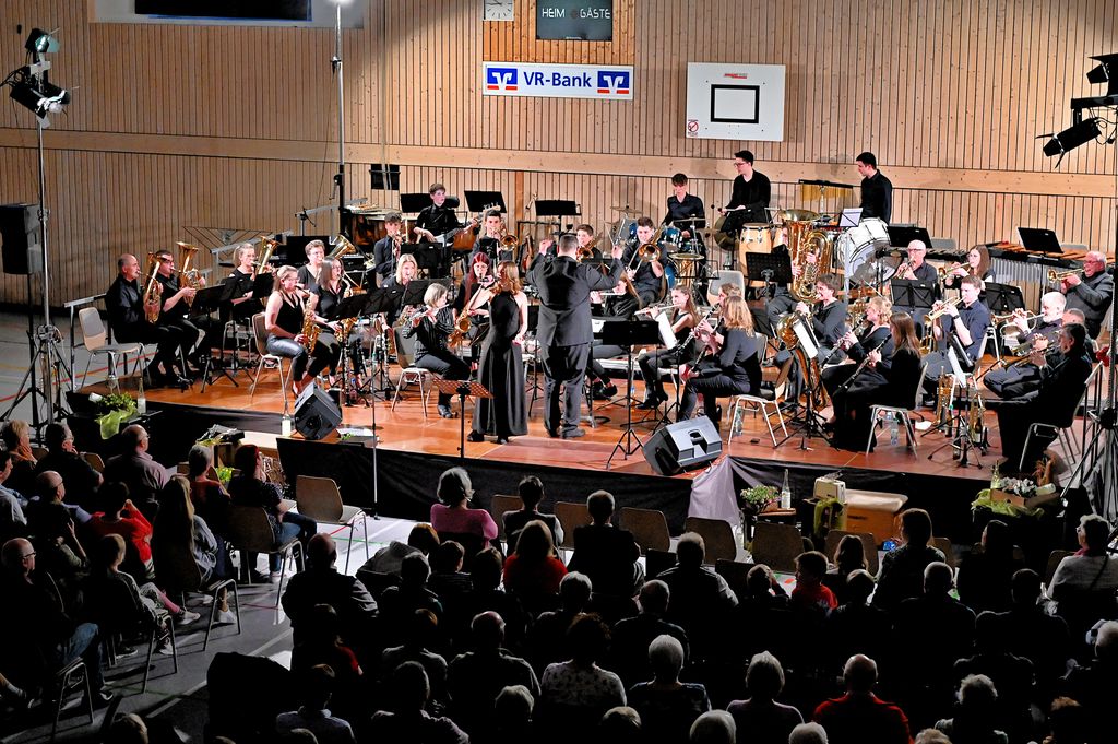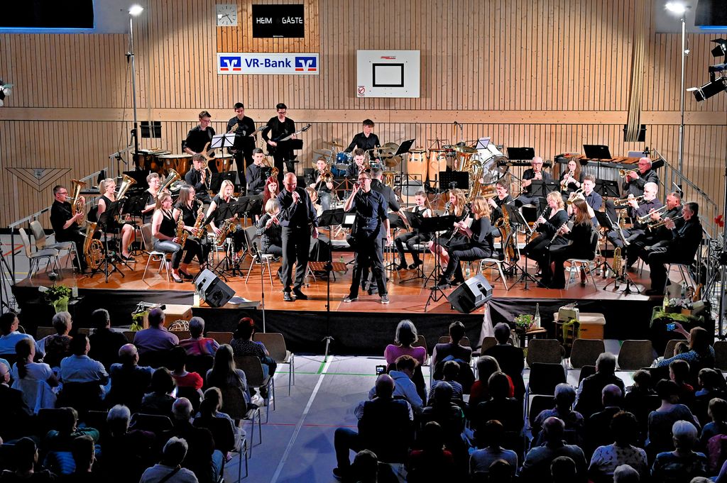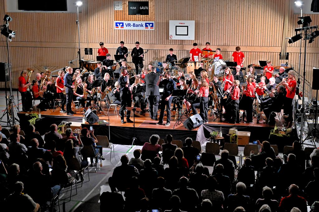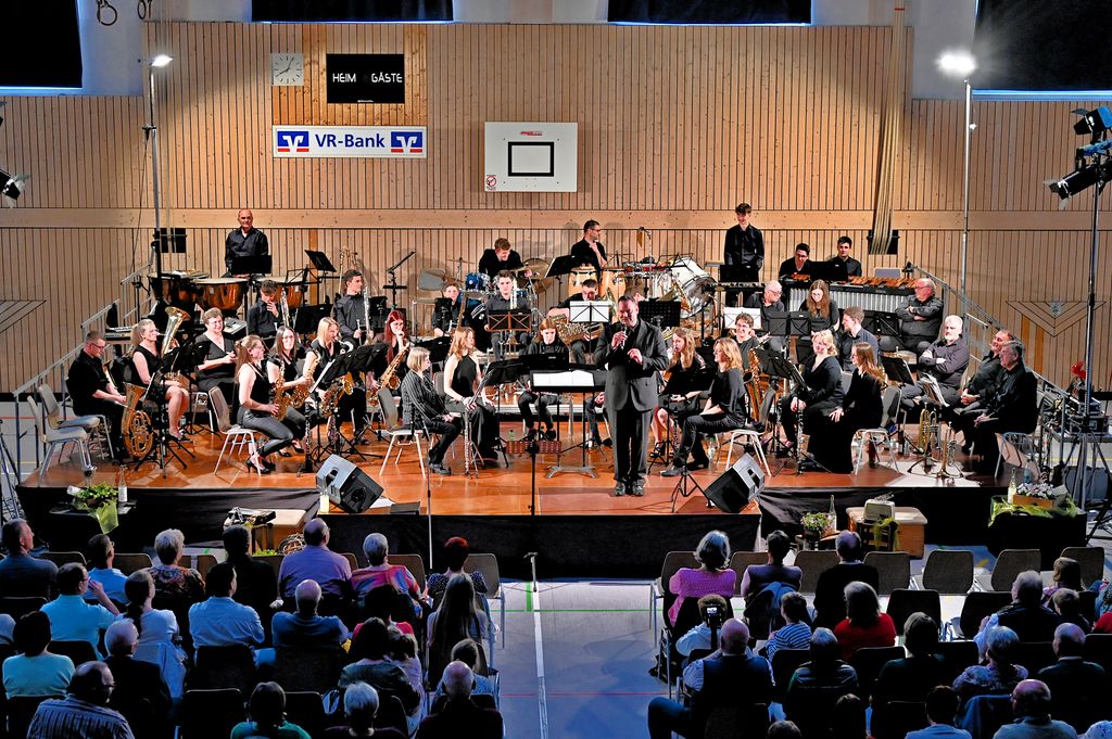 Dieser startete mit dem Konzertmarsch „Mit Freude und Schwung“ (S. Schlotter), gefolgt von der Polka „Pura Vida“ (L. Bruckmeyer). Dem klassischen Einstieg folgte ein wahres Fest an Klängen und Tönen. So sah man sich bei der „kleinen ungarischen Rhapsodie“ in die Puszta versetzt, um kurz darauf bei den „British Classics“ musikalisch im Vereinigten Königreich zu landen. Ein absolutes musikalisches Brett war „Innuendo“. Der „Queen“-Klassiker forderte die Musikerinnen und Musiker, aber auch die Sänger, Sebastian Reichert und Werner Mauder, durch seinen Mix an Stilen und unregelmäßiger Taktarten. Alle aber meisterten diese Herausforderung herausragend. „La dolce vita“ flutete bei „Just a gigolo“ die Bühne, auf der Werner Mauder gekonnt den Casanova gab. Zum Abschluss gab Amelie Büttner mit dem gefühlvollen „Lenas Song“ aus dem Film „Wie im Himmel“ ihr Gesangsdebüt. Natürlich entließ das Publikum das Orchester nach diesem atemberaubenden Konzert nicht ohne Zugaben. Und so erklangen „Imagine“ und – mit Unterstützung der ff-Kids - „Nessaja“.