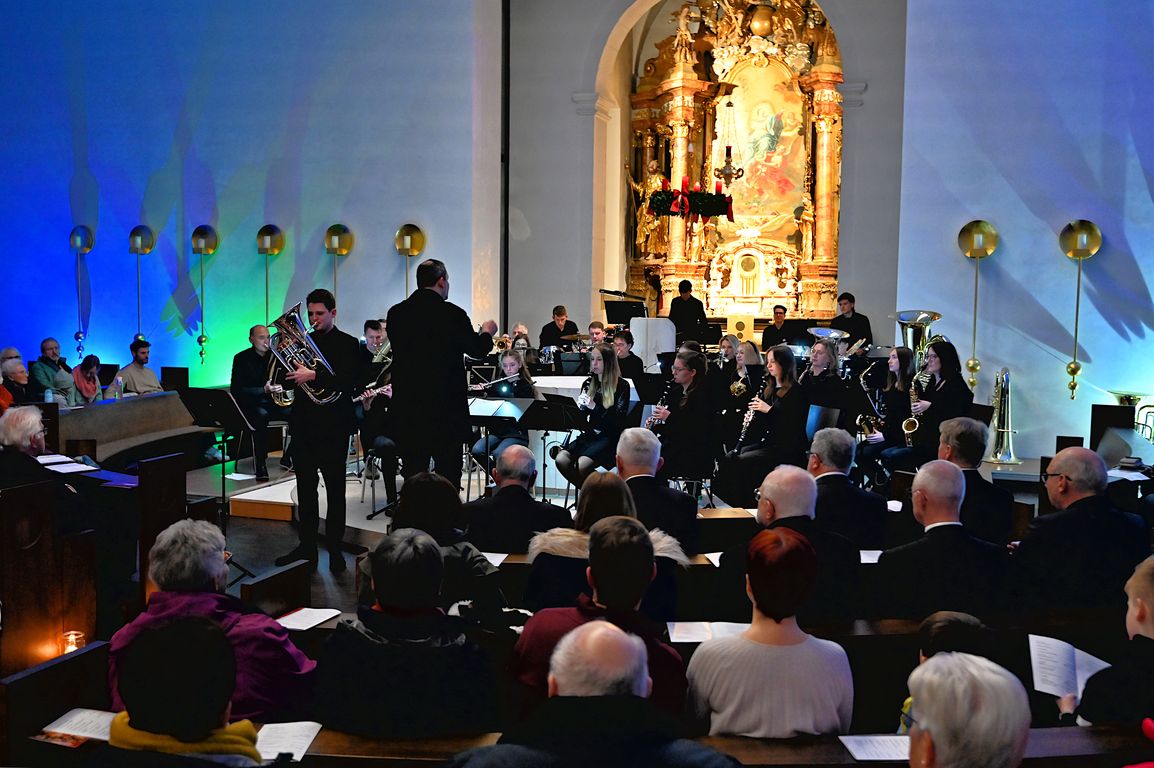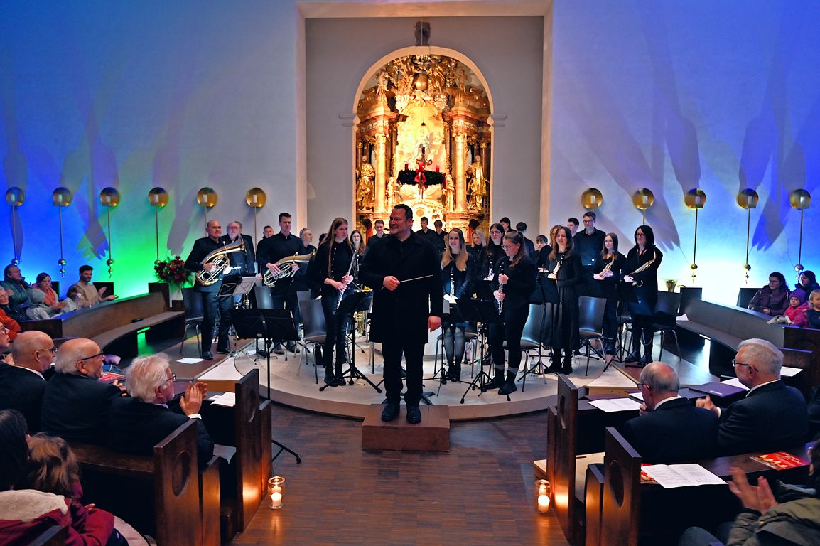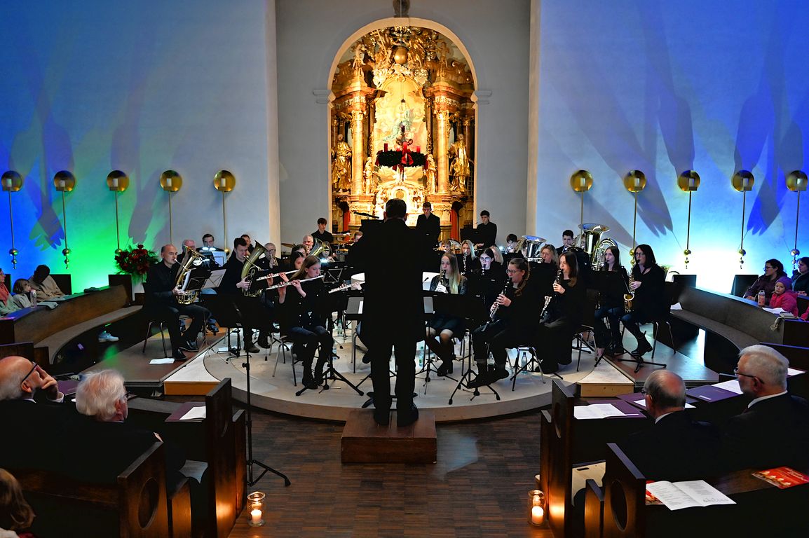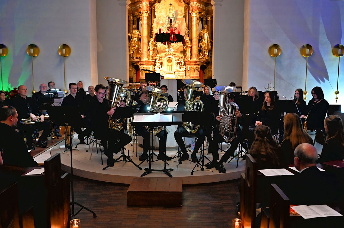 Am Vorabend des dritten Advents stimmte das Orchester unter der Leitung seines Dirigenten Bernhard Müßig das Publikum in der voll besetzten Kirche mit der Westminster Fanfare auf einen kurzweiligen Konzertabend ein. Einen ersten Höhepunkt hatte das Konzert mit dem Stück „Lux aurumque“. Das Werk, das ursprünglich für Chor komponiert wurde, wie Bernhard Müßig in seiner Moderation ausführte, verzaubert den Zuhörer durch seine ungewöhnlichen Klangkombinationen, fordert die Musiker jedoch aufgrund des langsamen Tempos, verbunden mit der besonderen Harmonie des Stückes.