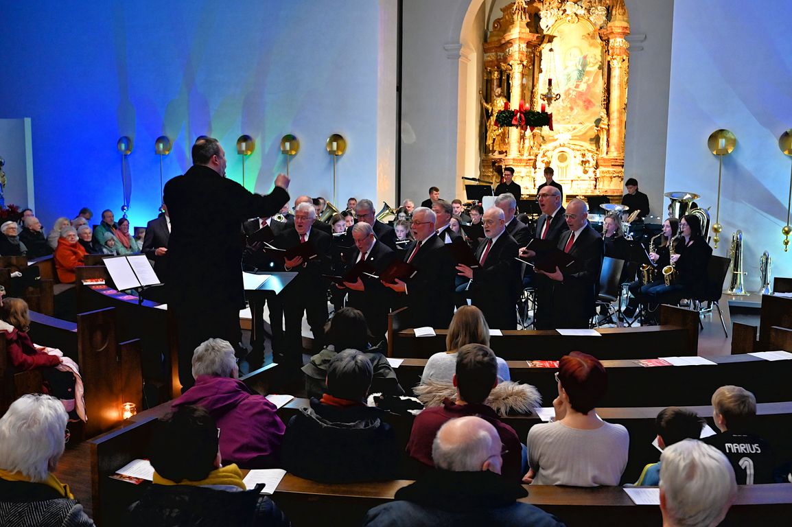 Wie bereits im Vorjahr bereicherte auch in diesem Jahr der Männergesangverein „Frohsinn“ die weihnachtlichen Darbietungen. Neben zwei Stücken, die der Chor a capella darbot, führten die Sänger gemeinsam mit dem Blasorchester ein Medley aus bekannten Weihnachtsmelodien, arrangiert von dem bekannten amerikanischen Komponisten und Arrangeur, Leroy Anderson, auf.