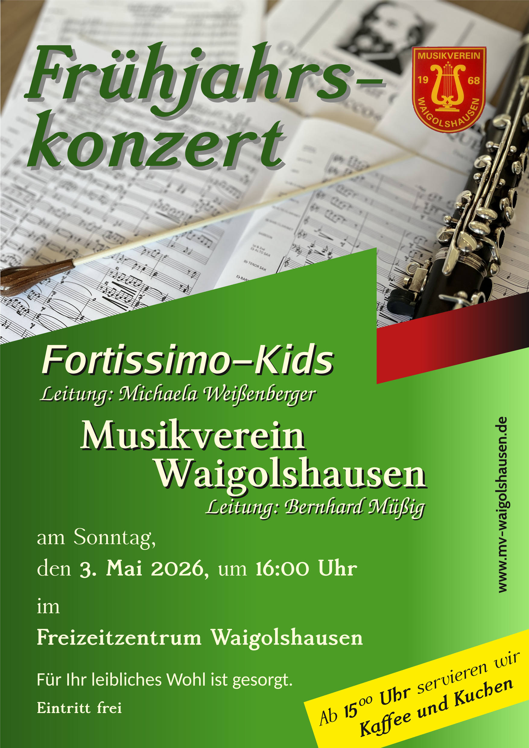 Der Musikverein Waigolshausen lädt herzlich zum diesjährigen Frühjahrskonzert ein. Unter der Leitung von Bernhard Müßig erwartet Sie ein abwechslungsreiches und unterhaltsames Programm in schönem Ambiente. Besonders freut uns, dass in diesem Jahr auch die Fortissimo-Kids, dirigiert von Michaela Weißenberger, wieder einen Beitrag zu unserem Konzert leisten werden.