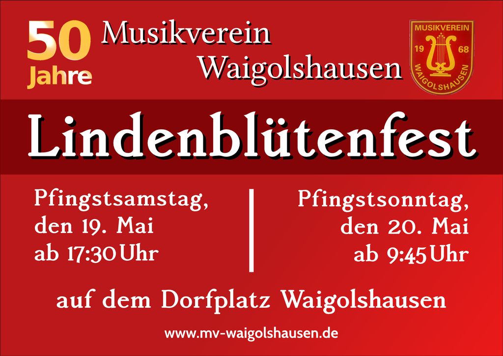 Am Pfingstsamstag und -sonntag (19. und 20. Mai) freut sich der Musikverein Waigolshausen, Sie auch dieses Jahr zu seinem beliebten Fest auf dem Waigolshäuser Dorfplatz einladen zu können. Wie jedes Jahr erwartet Sie ein kurzweiliges musikalisches Programm mit Kapellen aus der Region.